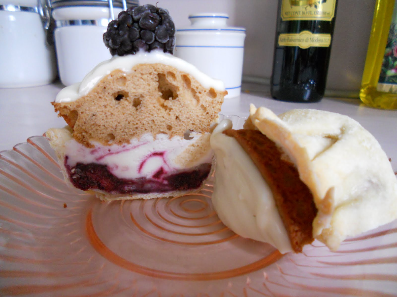 Blackberry pie a la mode cupcakes. My mother's blackberry pie recipe married to cream cheese frosting, with a blackberry vanilla ice cream, butter based flakey and savory pie crust and the moistest spice cake known to man.