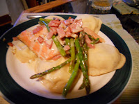 3. For the sauce, fry the bacon in a large skillet until fat has rendered and it’s crisp. Remove the bacon to a paper towel-lined plate, but keep as much grease in the pan as possible. Add the zest, juice and white wine to the pan. Reduce the wine by half over medium low heat. Add the cream and bring almost to the point of simmer, stirring constantly. Add the butter one piece at a time, stirring to fully incorporate. Adjust seasonings with salt and pepper, and keep warm over very low heat. Add the peas and asparagus 5 minutes before you plan to drizzle the sauce over the ravioli.