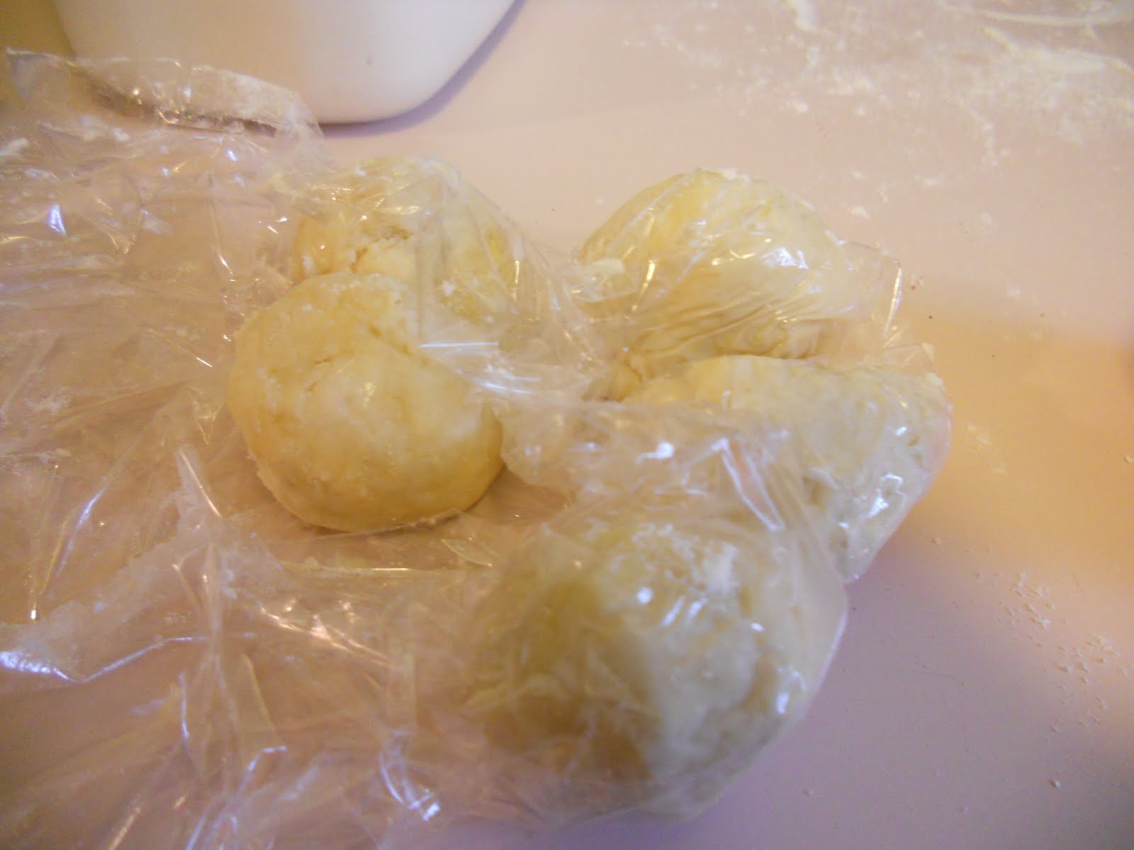 Meanwhile, make some pie dough. I mix 1 1/4 cups flour, 1/2 tsp salt with one stick of COLD butter until the mixture resembles coarse corn meal. Add tablespoons of ice water until the mixture is sticky but not too sticky and forms a cohesive dough. The trick to good pie crust: wrap in plastic wrap and stick in the fridge for 1-3 hours. It helps the gluten rest. I made the crust into 12 identical size balls (I think of them as grape shot) and leave them in the fridge. See the picture.