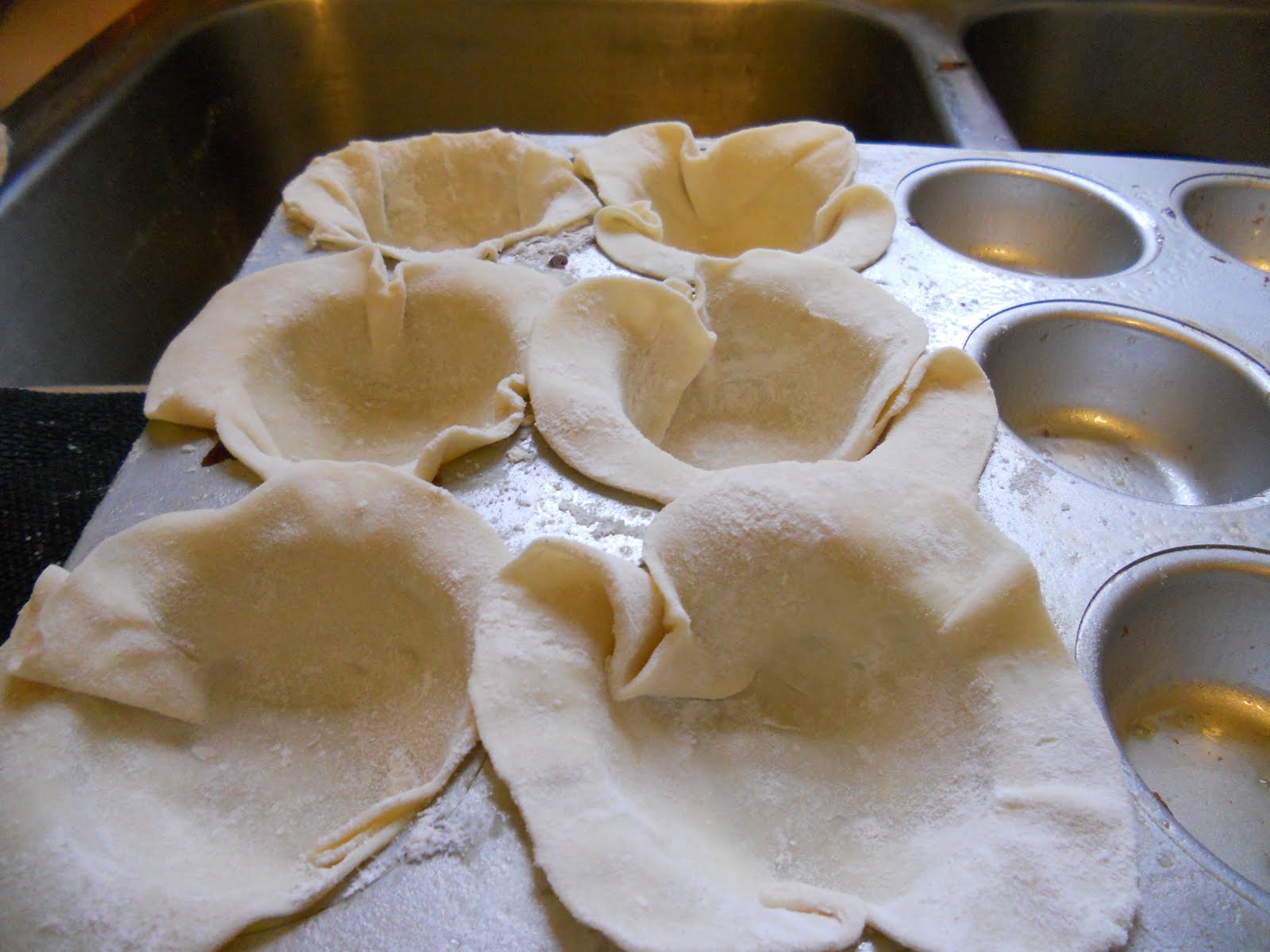 Roll out your 12 identical sized pie crusts into rounds and place into well-greased cupcake tin. Sprinkle a 1/2 tsp of flour/sugar mixture in the bottom, then add a tbsp or so of blackberry moosh into each of the floured pie crust rounds. Then sprinkle the rest of the flour/sugar mixture evenly over the smooshed blackberry mixture. The flour mixture will help the blackberries to not weep everywhere.